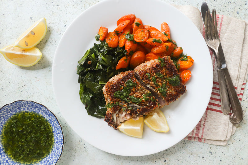 Plate black bass over collards and roasted carrots. Top with parsley sauce and serve.