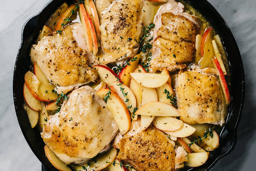 Nestle chicken thighs between apple slices. Transfer skillet to oven and braise 20-25 minutes, until chicken is cooked through and reaches 165 degrees, using an instant read thermometer.