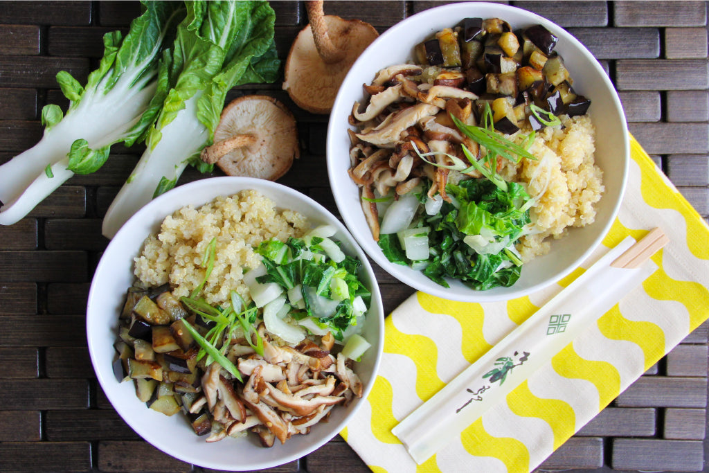Meanwhile, melt a teaspoon of butter in a sauté pan over medium-high heat. Once it starts to foam, add the tatsoi and a pinch of salt and cook until bright green and slightly wilted. Set aside on a large plate. Melt another teaspoon of butter in the sauté pan and add the eggplant with a pinch of salt, cooking until very soft and golden brown (add more butter to the pan if it dries up); set aside on the plate. Melt one more teaspoon of butter in the sauté pan and add the mushrooms and a pinch of salt. Cook until dark brown and tender; set aside on the plate.