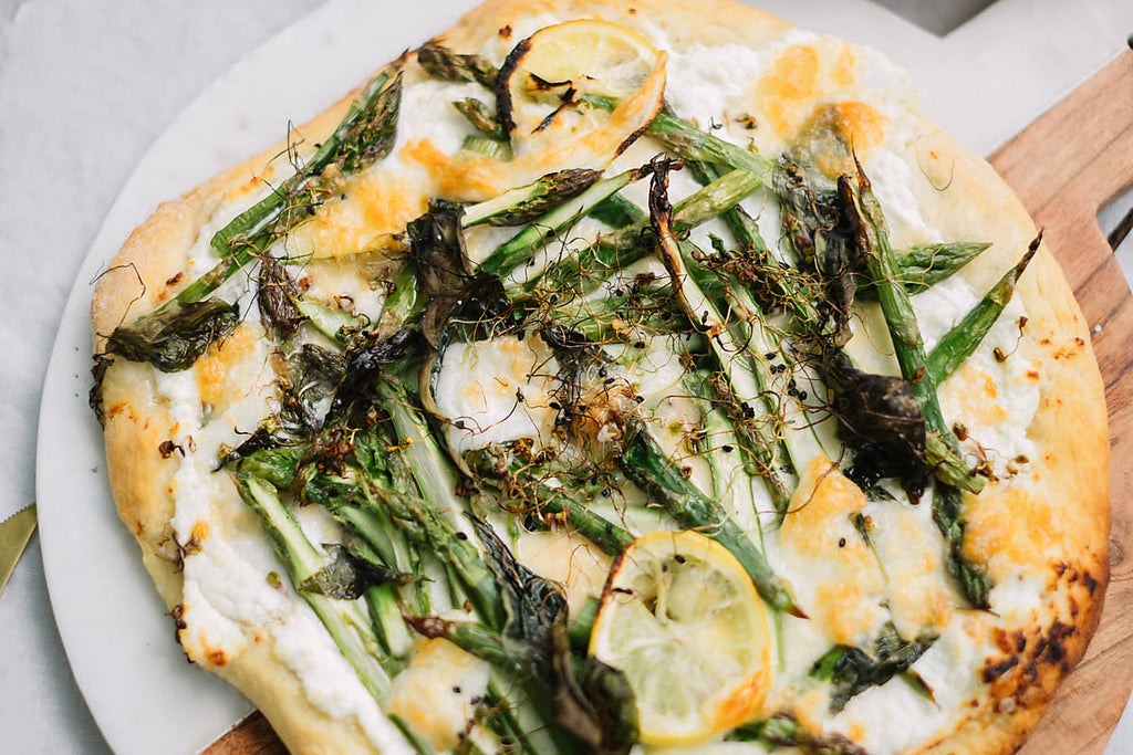 Coat a baking sheet with 1 tablespoon olive oil. Stretch dough on it to form a 16” x 6" oval. Spread asparagus and lemon slices on a separate baking sheet, drizzle with olive oil and season with sea salt and pepper. Place both sheets in oven. Remove pizza crust when it’s golden brown and puffed, 8–10 minutes. Remove asparagus when tender, 10-12 minutes. Spread a layer of mozzarella slices on pizza, leaving a crust border; top with asparagus and lemon slices and place back in oven until cheese melts. Remove, cut into slices and serve.