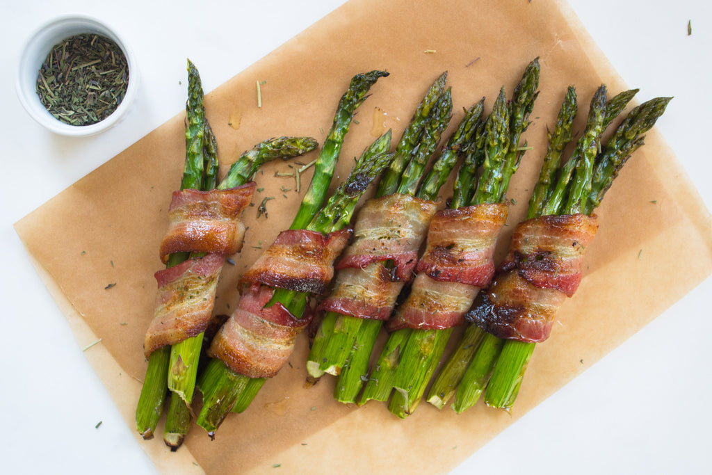 Preheat the oven to 375 degrees. Bring a large pot of water along with the vinegar to a boil over a high flame. Lightly oil a baking sheet. Starting at the base of the asparagus and working up, wrap each with a piece of bacon in a spiral and place on the baking sheet. Repeat with the remaining asparagus and bacon. Roast for 30-40 minutes until the bacon is crisp and completely cooked.