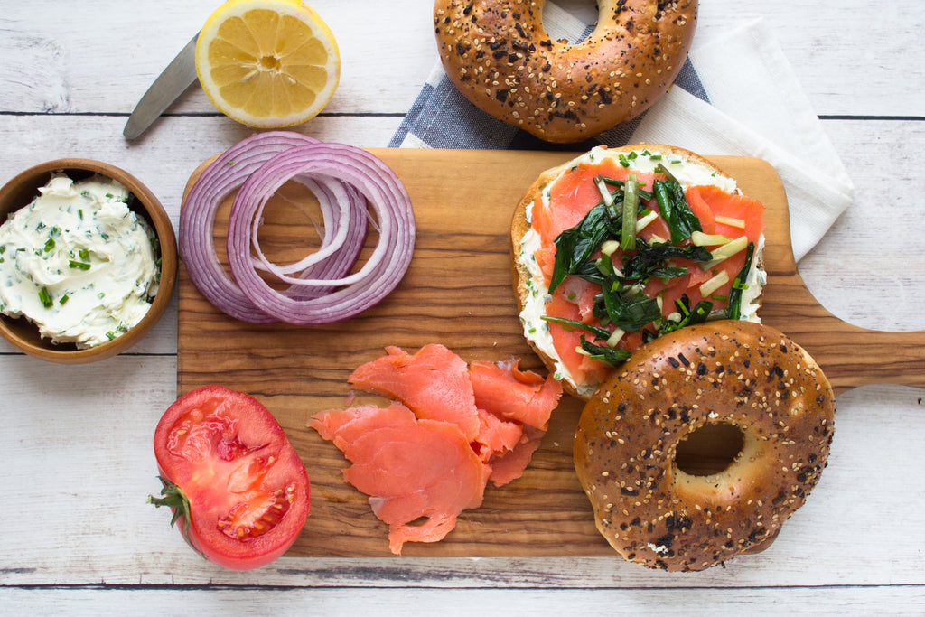 Heat olive oil in a pan, add ramps and sauté for about 3 minutes. Season with salt and pepper to taste. Finely mince chives and combine with crème cheese in a small bowl. Toast bagels and layer on chive crème cheese, smoked salmon, sautéed ramps, tomato and onion slices.
