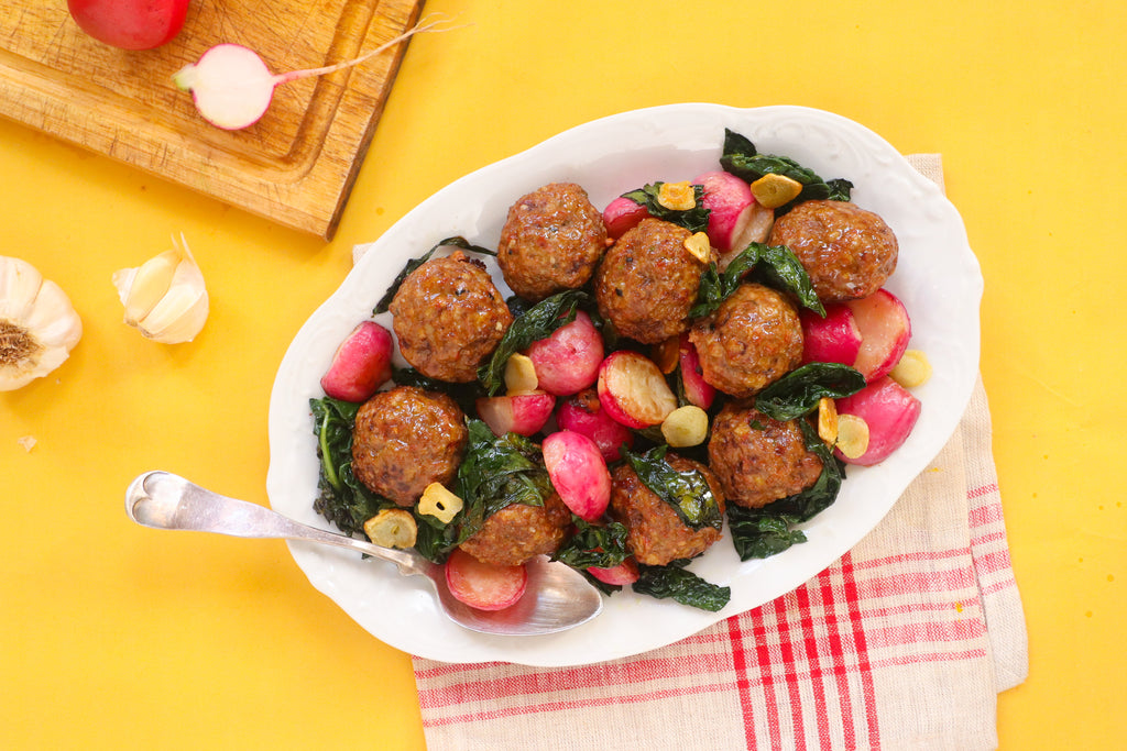 Meanwhile, heat 1 tablespoon oil in a large skillet over medium-high. Add sliced garlic and cook until golden; spoon out the garlic and set aside. Add the remaining oil and the radishes and cook, tossing occasionally, until golden and crisp-tender, 5–7 minutes. Add kale and cook until just wilted. Stir the garlic back in and remove pan from heat. Remove meatballs from oven and add to the pan with kale and radishes along with their juices. Toss to combine and serve.