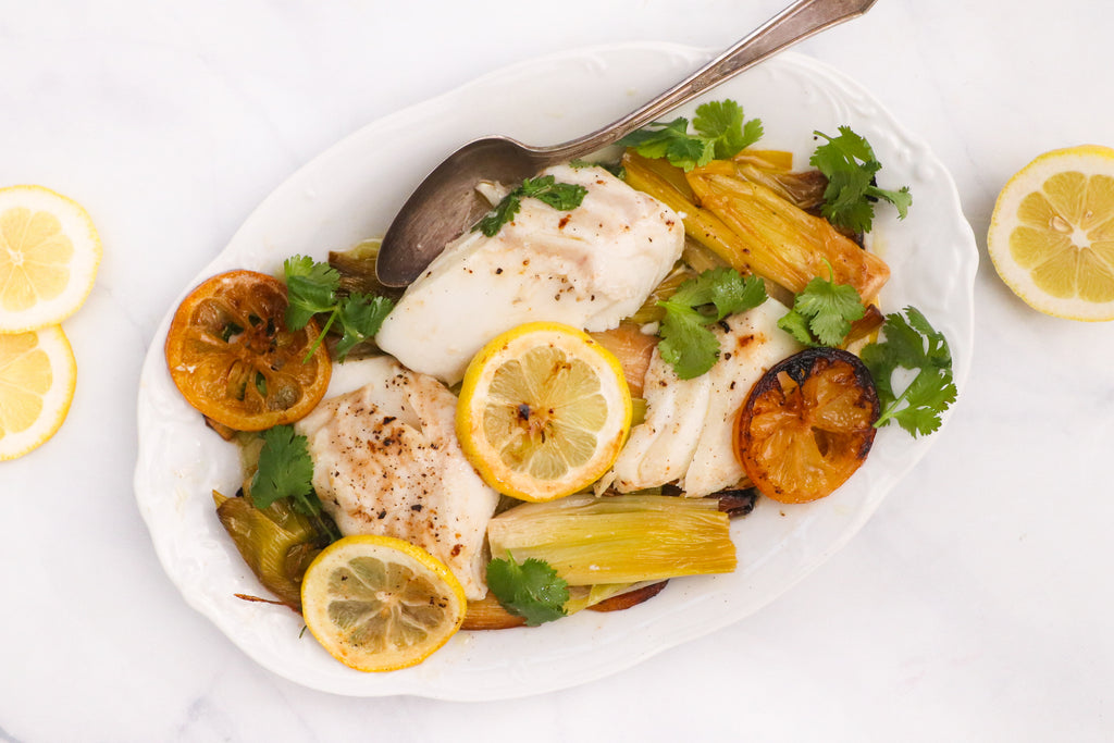 Reduce oven temperature to 275 degrees. Season rockfish with sea salt and place over leeks in roasting pan. Top with remaining lemon slices and pour oil back over it. Roast until rockfish is just cooked through and starting to flake, 30-35 minutes.
