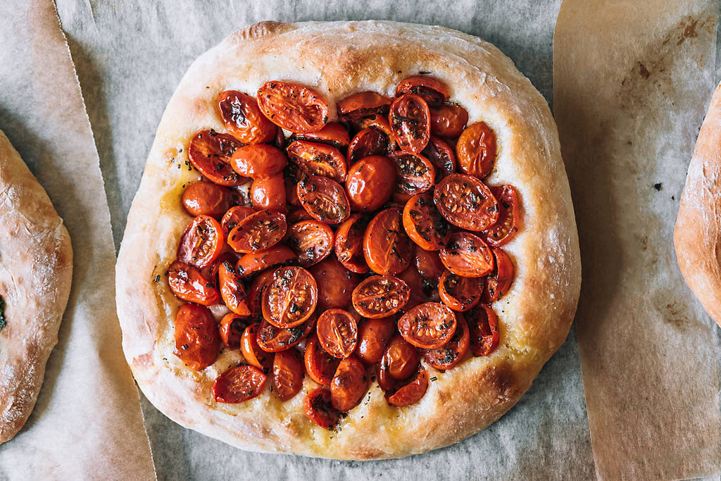 On a lightly floured surface, carefully stretch dough into a 10-12 inch circle. Transfer to prepared baking sheet. Spread the dough with crème fraîche, if using, and top evenly with onions. Add tomatoes on top.