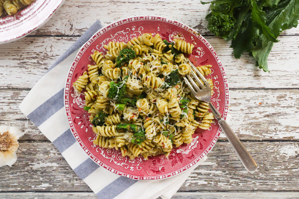 When pasta is done, drain it, reserving a little cooking water. Toss fusilli in skillet, adding 3 tablespoons pesto and broccoli rabe, moistening with a little reserved water, if necessary. Adjust seasonings and serve with a sprinkle of red pepper flakes and freshly grated parmesan, if desired.