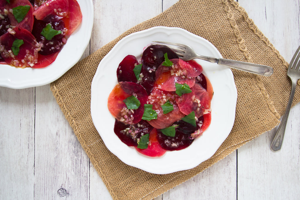When beets are cool enough to handle, rub skins off with your fingers. They should slip off easily. Using a mandolin or sharp chef’s knife, slice into very thin rounds. Layer slices on a platter, drizzle with vinaigrette, and top with torn basil.
