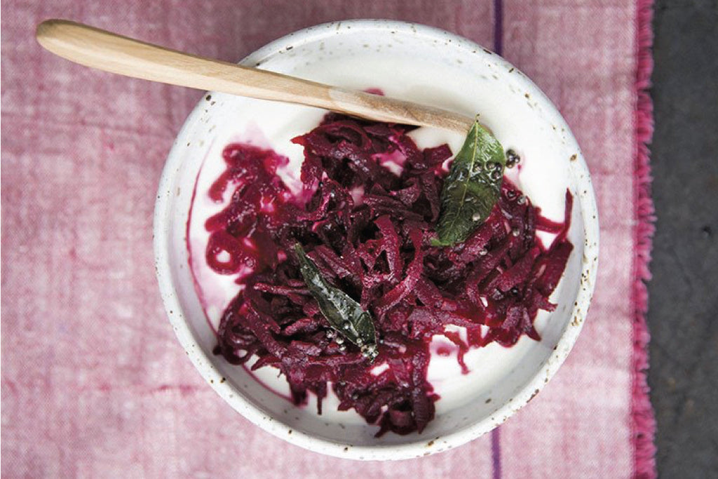 When the beets have cooled, combine them with the beaten yogurt, coconut and chopped cilantro. Add the remaining 1⁄4 teaspoon salt. Garnish with chopped cilantro and serve.