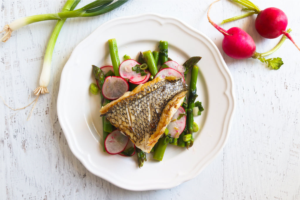 Divide asparagus salad between two plates and top with fish along with pan juices.