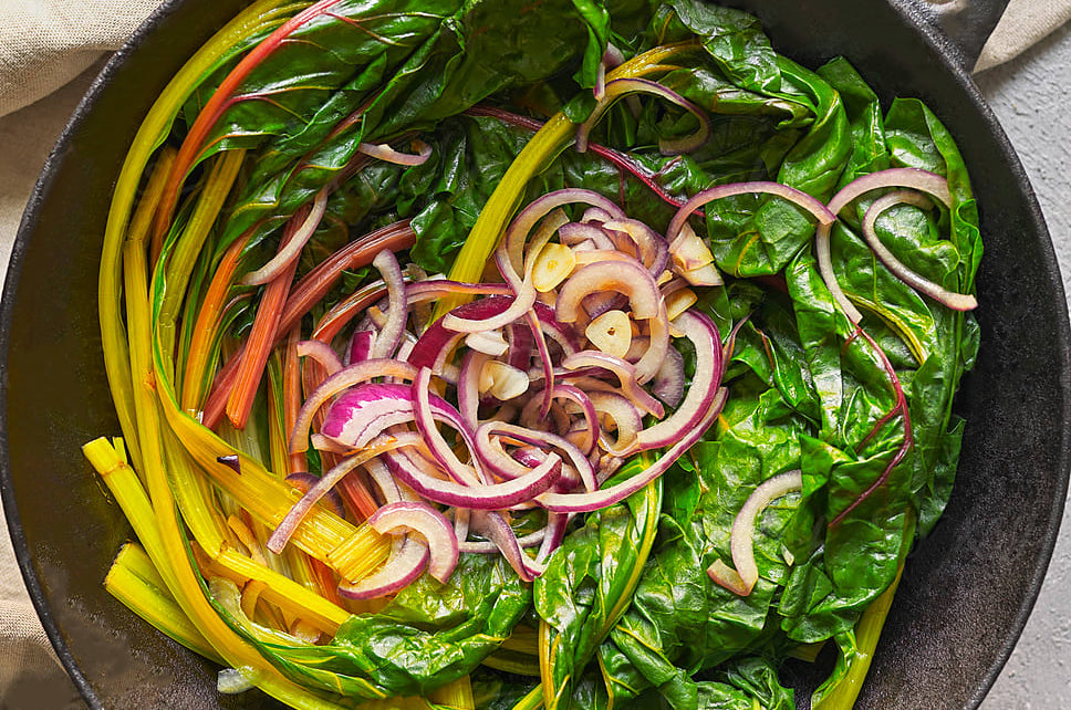 Heat oil in large pot over medium. Add red onions and cook 5–8 minutes, stirring occasionally, until softened. Add garlic and reserved chard stems; season with sea salt and pepper. Cook 7–10 minutes, stirring occasionally, until stems are crisp-tender. Add reserved chard leaves, a handful at a time, letting them wilt slightly before adding more. Add sauce, stir to coat, and continue to cook until completely wilted. Season with sea salt and pepper, if needed.