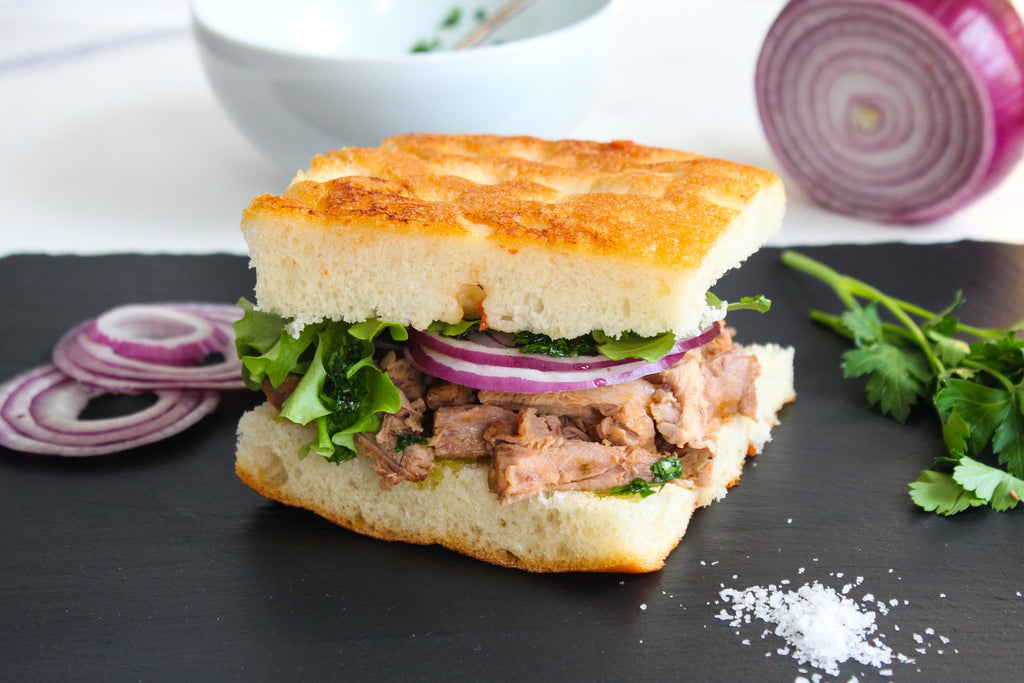 When ready to eat, brush focaccia with olive oil and garlic and toast on the top rack of the a preheated 250 degree oven for 3-5 minutes. When bread is toasty, add meat, pickled onions, mixed greens and parsley leaves. Grate fresh SarVecchio over the toppings. Serve with crunchy roasted potatoes or a side salad.