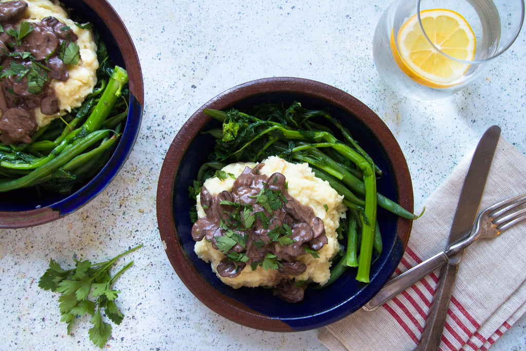 Serve mushroom sauce over mashed parsnips with blanched broccoli rabe.