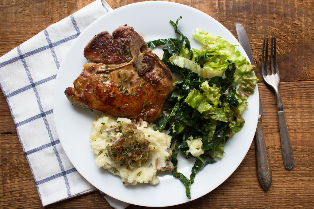 Spoon the leftover butter and herbs from the pork over the chops and the mashed turnips. Serve by itself or with a side of green salad.