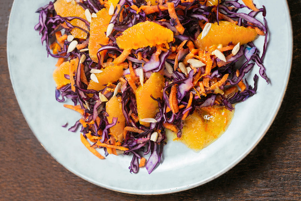 Using a mandoline or sharp chef’s knife, shred cabbage. Grate carrots on a box grater. Combine cabbage, carrot, shallots, garlic, lime juice, olive oil, honey, orange juice, and zest in a large bowl; toss well and season with sea salt and pepper, to taste. Cover and refrigerate at least 1 hour or overnight. Using a sharp knife, carefully slice top and bottom of orange. Using even downward strokes, slice skin away from flesh and discard. Remove any remaining white pith. Cut between membranes to segment the orange, retaining any juices. Remove salad from fridge and stir well, then add orange segments. Adjust seasoning, if needed, and serve.