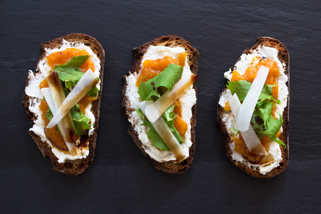 Smear about two teaspoons of chèvre on each piece of toast and top with one tablespoon of medlar. Garnish with arugula. Drizzle with balsamic and serve immediately.