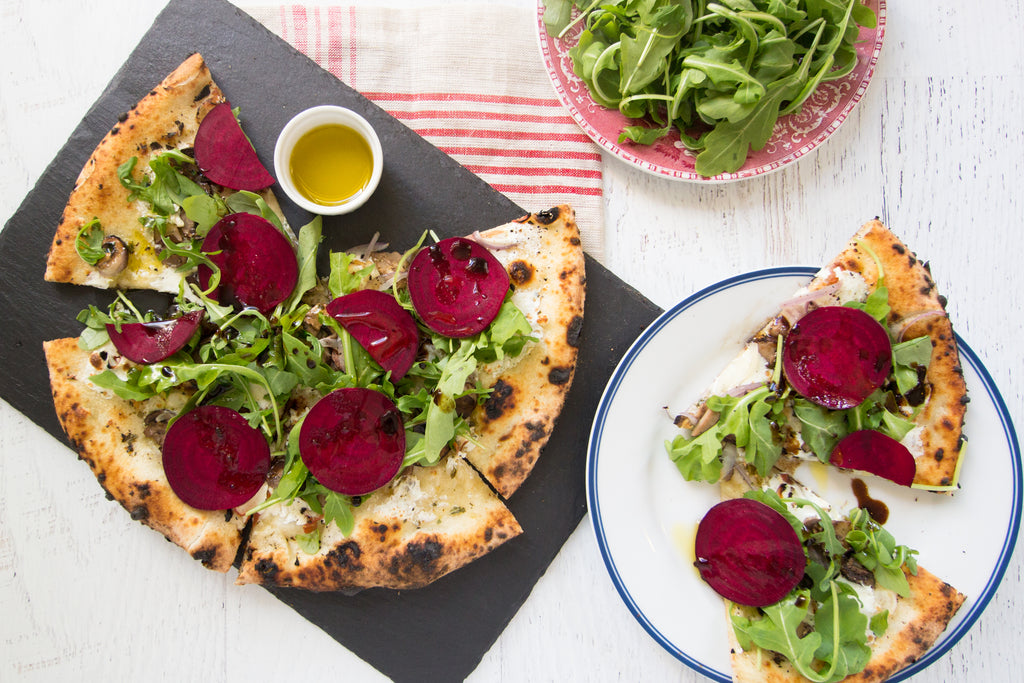 Spread onions on the dough evenly, leaving room for a border crust. Top with the mozzarella and season with a pinch of salt. Place in the oven and bake until the cheese is bubbling and the crust is golden brown. Remove from oven and top with arugula, beets and a drizzle of olive oil.