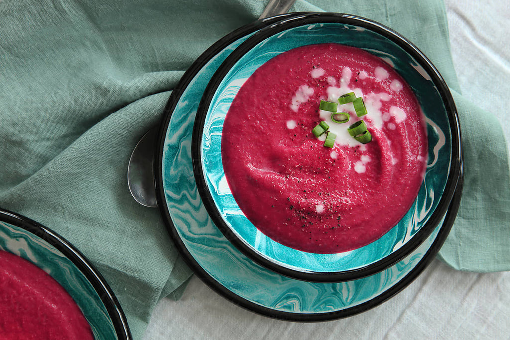 Heat oil in medium pot over medium-high heat, add onion, and sauté 4 minutes until just translucent. Stir in cauliflower, beets, and 1 teaspoon sea salt. Add broth; bring to boil. Reduce heat and simmer 20 minutes, until beets and cauliflower are tender. Remove from heat; stir in dill, saving a teaspoon for garnish. Let soup cool 10 minutes, then purée in batches in blender or with immersion blender until smooth, adding a little water if necessary to thin.