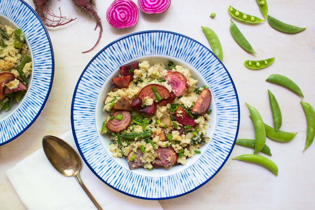 Remove the green tops from the beets and quarter the roots; set greens aside. In a large skillet, heat 2 tablespoons olive oil over low to medium flame, add 2 cloves garlic and diced onions. Sauté the quartered beet roots for about 10 minutes with the garlic and onions. Remove the garlic cloves. Add cauliflower and cook for about 3 minutes in the skillet, mixing regularly. Add the Romano beans and sugar snap peas and cook for 1 to 2 minutes.