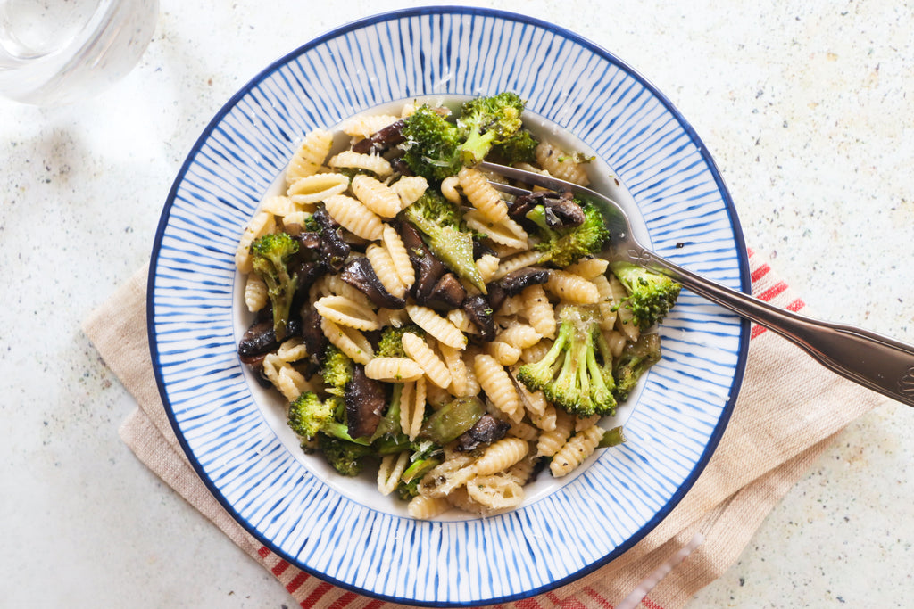 Bring a large pot of well-salted water to a rolling boil. Cook the pasta until al dente. Drain and transfer to the skillet with the broccoli, reserving a cup of the pasta water. Raise the heat to medium-high. Toss the pasta with the broccoli and mushrooms. If it seems a little dry, drizzle in some of the pasta water to develop a bit of moistness and shine. Adjust seasoning to taste.