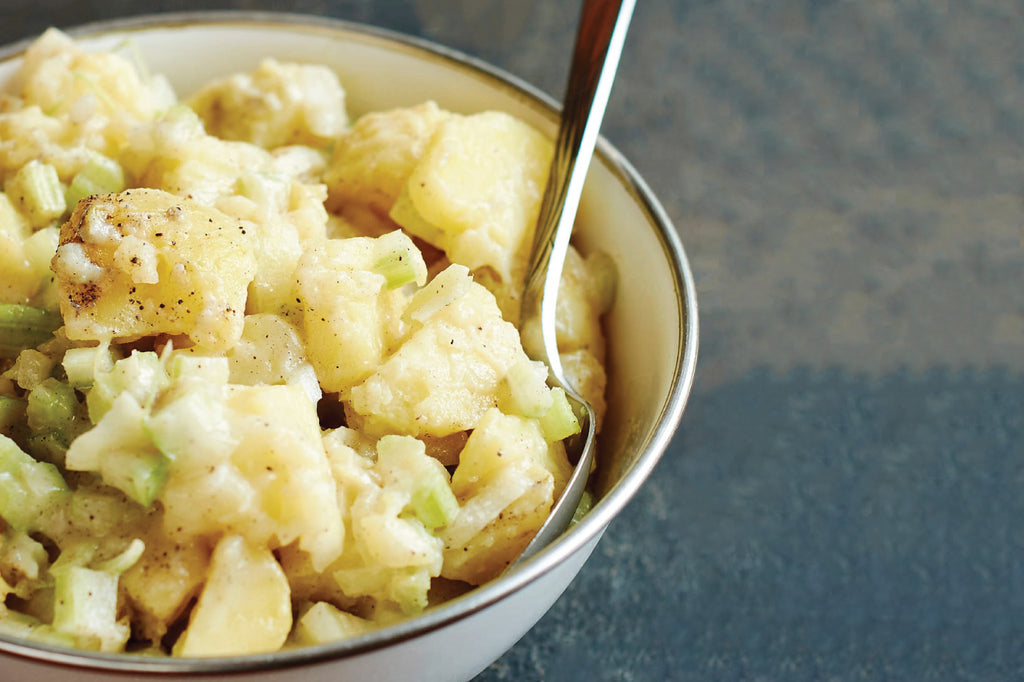 Combine potatoes and mustard dressing and chill until a half hour before serving; potatoes should be served at room temperature.