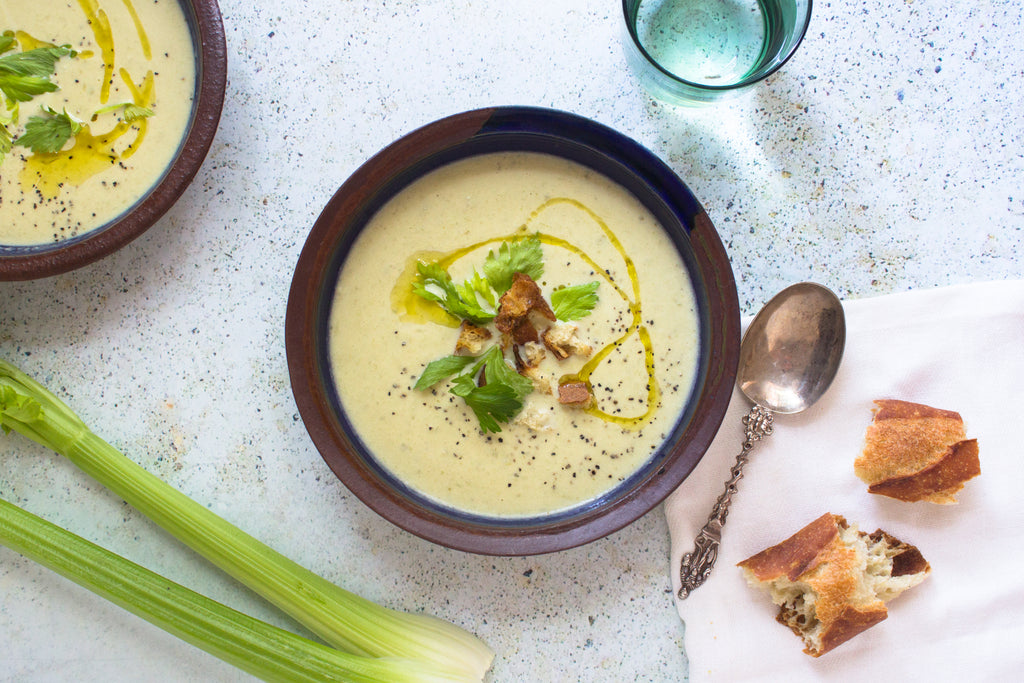 Heat olive oil in medium pot. Add garlic and onions and sauté until fragrant; then add celery and continue to cook 10 minutes until celery begins to soften. Add stock and adjust heat to simmer. Let celery simmer 20 minutes or until soft.