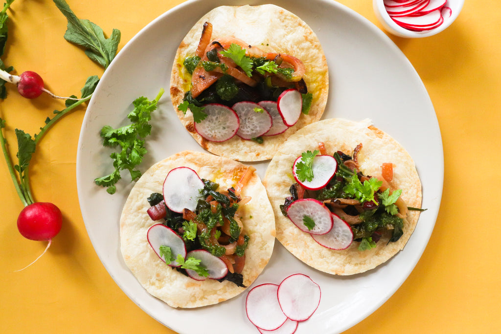 Divide chard and fennel between tortillas and top with cilantro sauce and sliced radishes.