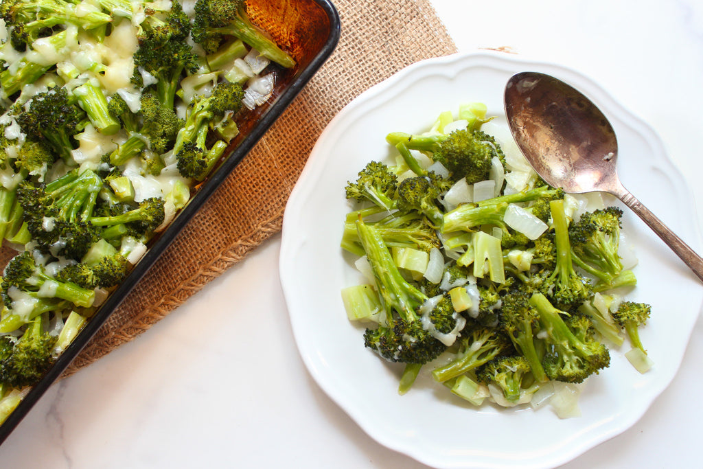 Heat the oven to 400 degrees. In a large mixing bowl, toss together the broccoli, onion, garlic and olive oil with a pinch of salt and pepper. Pour onto an oiled sheet tray and roast until tender and brown, about 30-35 minutes, turning and stirring once.