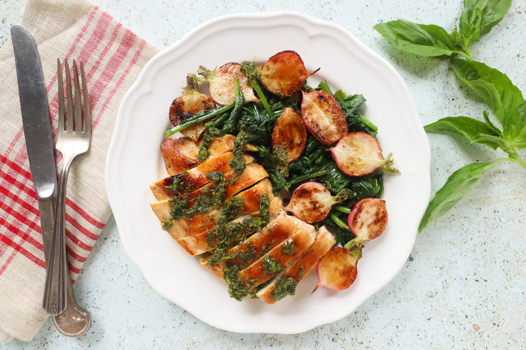 Chicken Breast with Hakurei Turnips and Basil Chimichurri