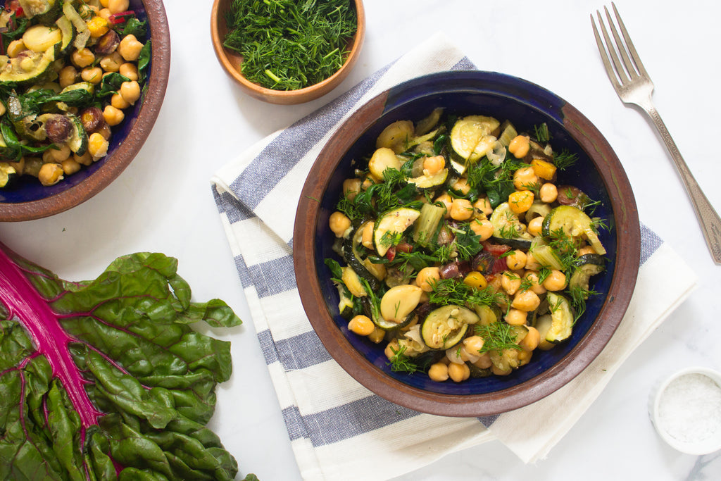 Heat the oil in a large skillet over a medium-high heat. Add zucchini and carrots and sauté until tender. Add all of the remaining ingredients (chickpeas, salt, cinnamon, cumin, cayenne, tomato paste and lemon juice). Add 1/2 cup water and mix thoroughly. Bring to a simmer, reduce heat to low, cover and cook for 10 minutes. Season with salt and pepper and more spices, if desired. Divide between two plates and top with a good amount of minced dill.