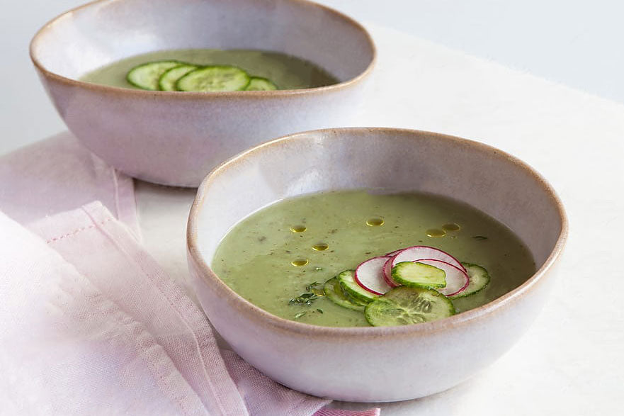 Season soup again just before serving. Pour into bowls. Garnish with sliced cucumber, dill, and a drizzle olive oil; and serve.