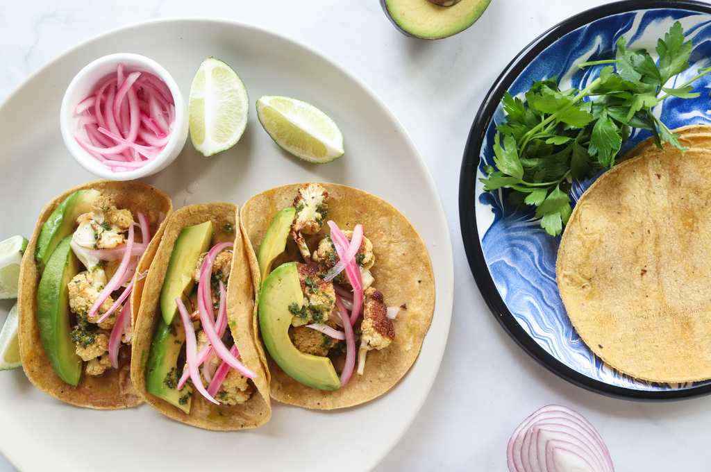 Divide cauliflower between tortillas. Drizzle with chimichurri and top with pickled onion and sliced avocado.
