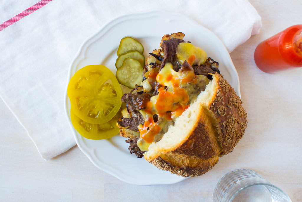 Slice loaf once through the middle to create two half moon shapes, then slice along the edge to make two buns. Add steak to bottom of each bun, folding it onto the bread instead of laying it flat so that the cheese has crevices to melt into. Add a handful of caramelized onions to the meat, then add the slices of the cheese. Place both sides of bread on a baking sheet in the oven for about 1 minute, just until the bread is warm and the cheese melted. Serve with your choice of extra toppings and sides (we’re really into pickled green tomatoes and hot sauce, but some crispy home fries would be nice too).