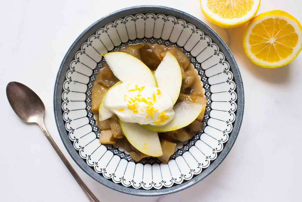 Heat butter in a small sauce pan until it starts to foam. Add pears, sugar, cinnamon, cardamom and black pepper. Add water and allow to stew for 10-20 minutes, or until soft. If the liquid evaporates and your fruit starts to scorch, add 1 Tbsp. extra water at a time. Once the fruit is soft, remove from the heat and allow to cool completely.