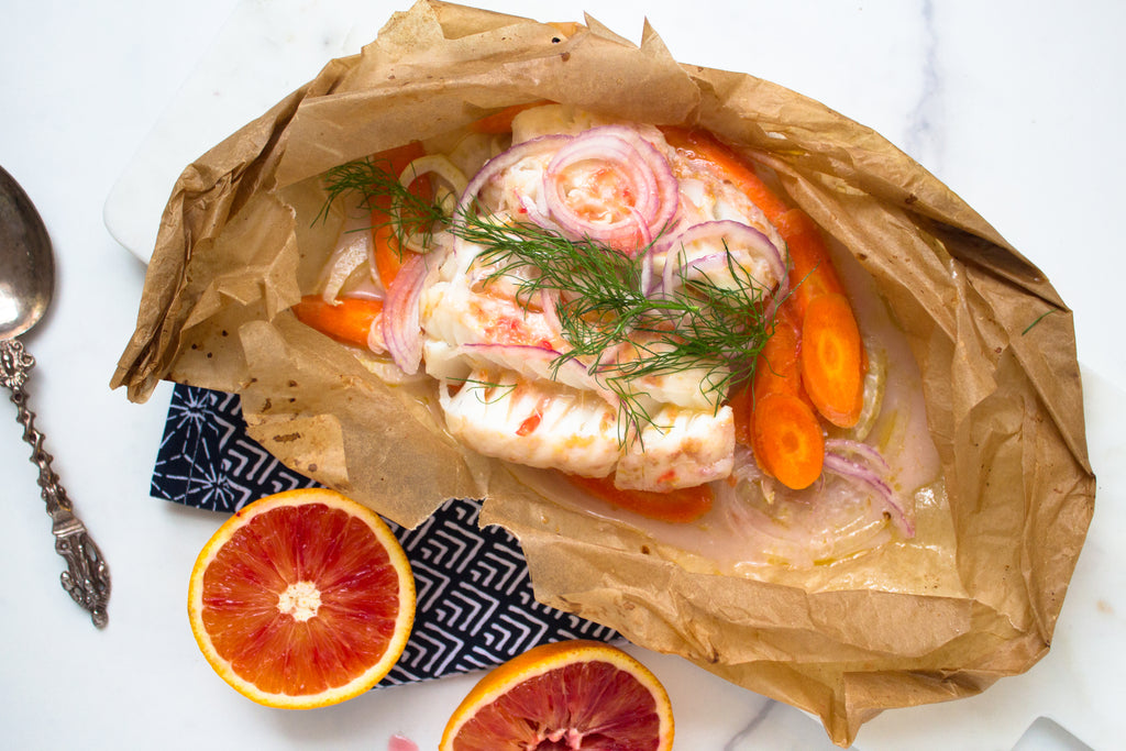 Seal the parchment packs by folding over the square. Fold the parchment tightly along the outside edge, curving around the fish and sealing it inside. Place in the oven on a baking sheet for 8-10 minutes until the fish is cooked through and completely opaque.