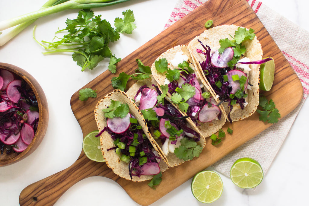 Using a mandolin or sharp chef’s knife slice radishes into paper thin rounds and cabbage into thin strips. Transfer to a medium bowl and mix in the scallions, 1 Tbsp. olive oil, lime juice and 1/4 tsp. of salt. Massage and squeeze the cabbage with your hands to help it release its liquid and begin wilting. Set aside.