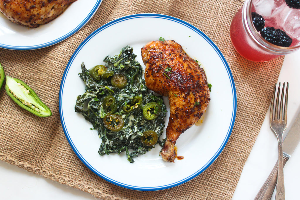 When the chicken is about 30 minutes from being done, start the collards by melting the butter in a large pot over medium-high flame. Sauté the jalapeño rings with a pinch of salt for about 3 minutes. Add the collards and stir to combine. Continue stirring and cook for another 7 minutes until slightly wilted and tender. Add the water or broth and stir. Simmer for 10 minutes, stirring occasionally. Add the cream and stir to combine. Cook for another 10-12 minutes on a low simmer, until the chicken is finished.
