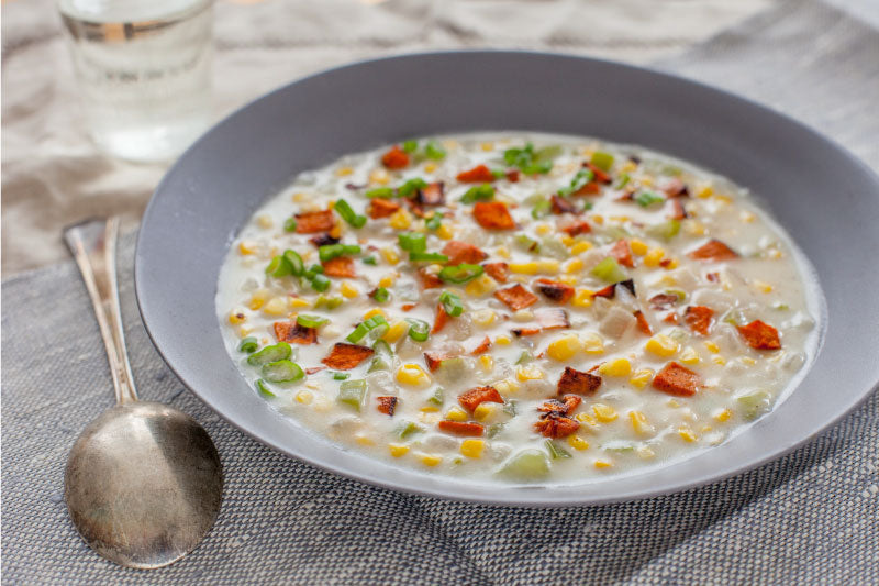 Trim the roots off the scallions and clean away any wilted leaves. Cut them in half from top to bottom and then into thin slices. In a soup pot, heat the remaining olive oil over medium heat. Add scallions and sauté for a few minutes. Add corn and continue cooking for a few more minutes, letting the scallions and corn brown in a few spots. Add milk and turn down to a very low simmer. If you like a thicker chowder, you can remove a cup of the milk/corn/onion mixture, purée it and return it to the pot. This is my favorite trick for achieving a creamy soup. Add sweet potato to the chowder and season with sea salt and pepper. Serve garnished with more sliced scallions and cilantro.