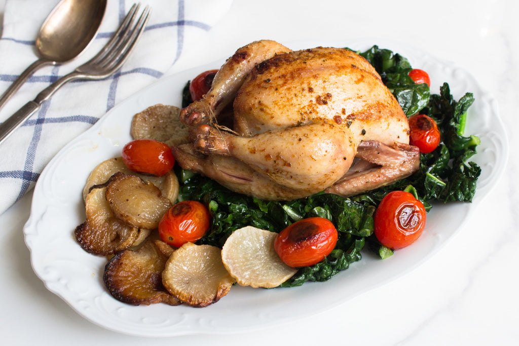 While the hen is roasting, cube rutabaga and rinse under cold water until the water runs clear. Rinsing the starch off will allow the cubes to become crispy. Pat dry, then toss with olive oil, salt and pepper in a large bowl. Spread the cubes on a baking dish and roast in the oven with the hen is roasting until crispy on the outside and soft in the middle, about 20-30 minutes.