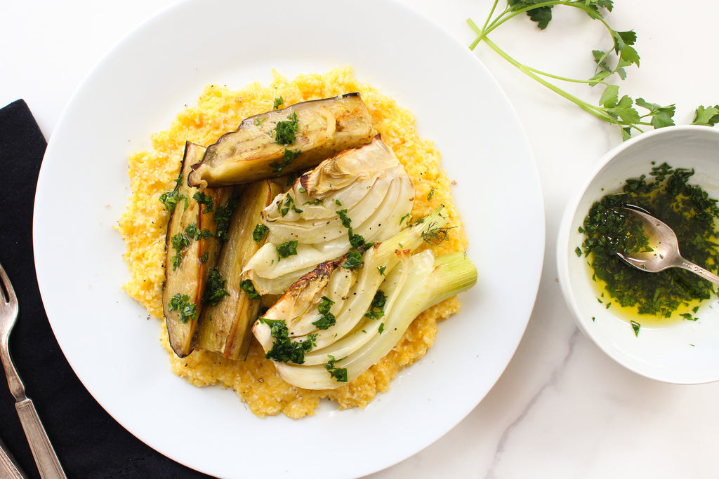 Top a bowl of polenta with the broiled vegetables, then sprinkle some of the parsley mixture on top. Add a poached egg or grate some cheese over top, if desired.