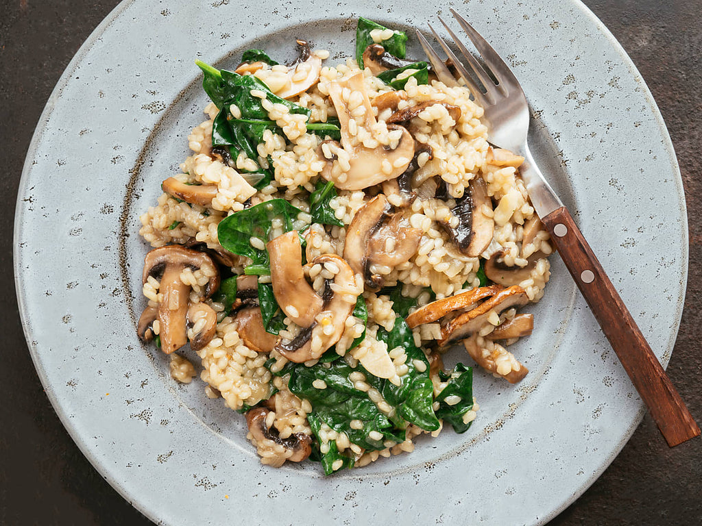 When rice is al dente, reduce heat to low. Add 2 more ladles broth, Parmesan cheese, and a few grinds black pepper. Stir vigorously 1 to 2 minutes until risotto is thick and creamy. Then stir in sautéed mushrooms and kale. Taste and add additional salt, if desired. Serve topped with lemon zest, Parmesan shavings, fresh thyme, and black pepper.