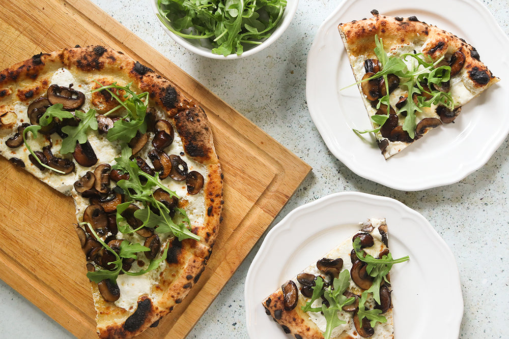Coat baking sheet or pizza pan with thin layer olive oil or dusting of cornmeal. On clean working surface dusted with flour, gently stretch pizza dough to fit pan, roughly a 12" circle or 10" x 6" rectangle will do. Gently place dough in pan; pierce well with fork. Lay out mozzarella slices and spread mushroom mixture on top.