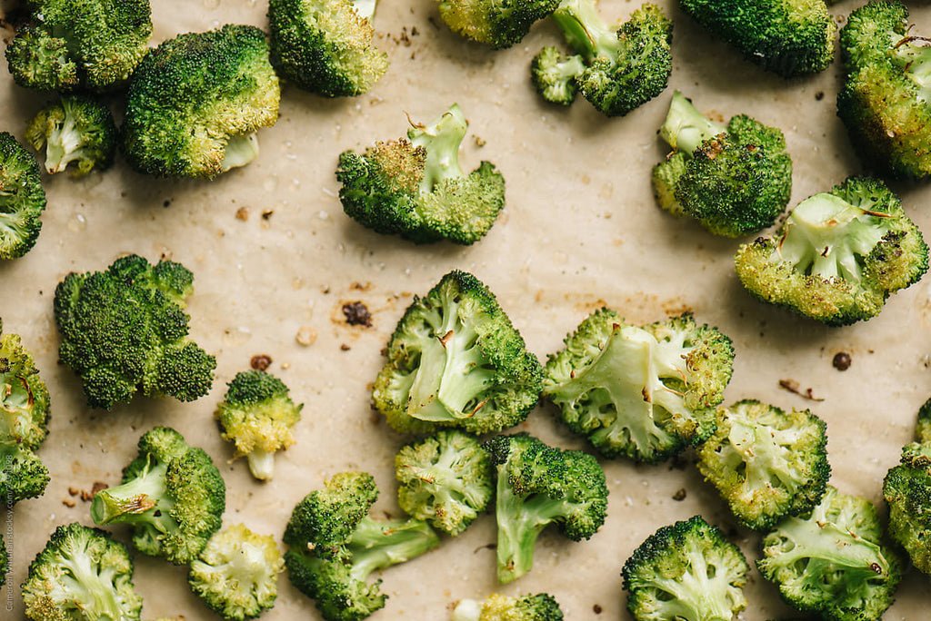 Place broccoli on a sheet pan with garlic cloves; sprinkle with seasonings and drizzle with olive oil. Using your hands, toss and massage the florets until the seasonings and oil are evenly incorporated.