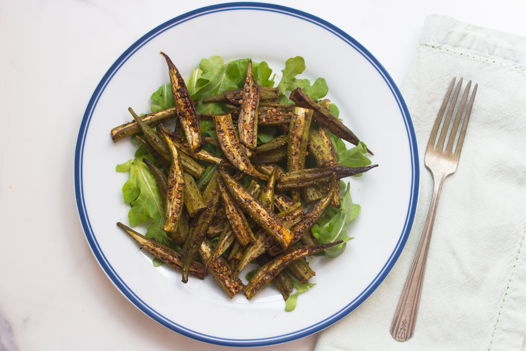 Preheat oven to 450 degrees. Trim the okra by cutting away the stem ends and tips -- just the very ends. Slice okra in half, lengthwise and place in a large bowl. Add 1 tablespoon olive oil, a pinch of cayenne, sea salt and pepper; stir to coat the okra halves. Place okra on a baking sheet in a single layer. Roast in the oven for 20-25 minutes, shaking or stirring at least twice during the roasting time. You'll know the okra is ready when it's lightly browned and tender. Serve hot -- they tend to lose their crispy texture as they cool.