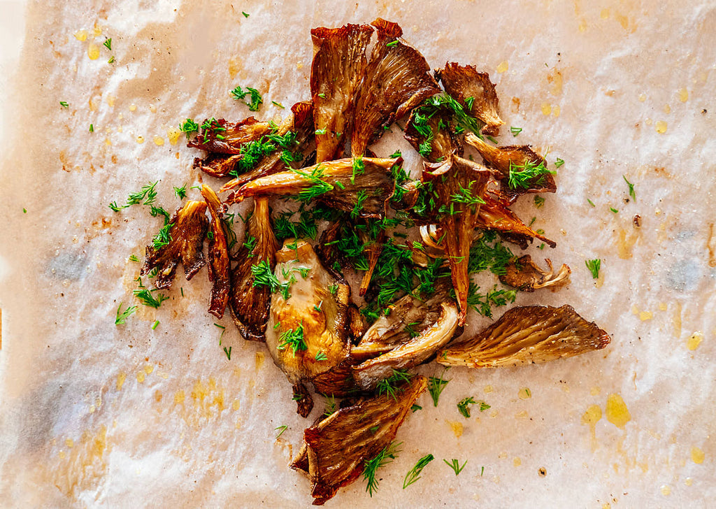 Roast 30 to 40 minutes, or until mushrooms are brown and crispy. Sprinkle with cilantro, flaky sea salt and a squeeze of lemon.