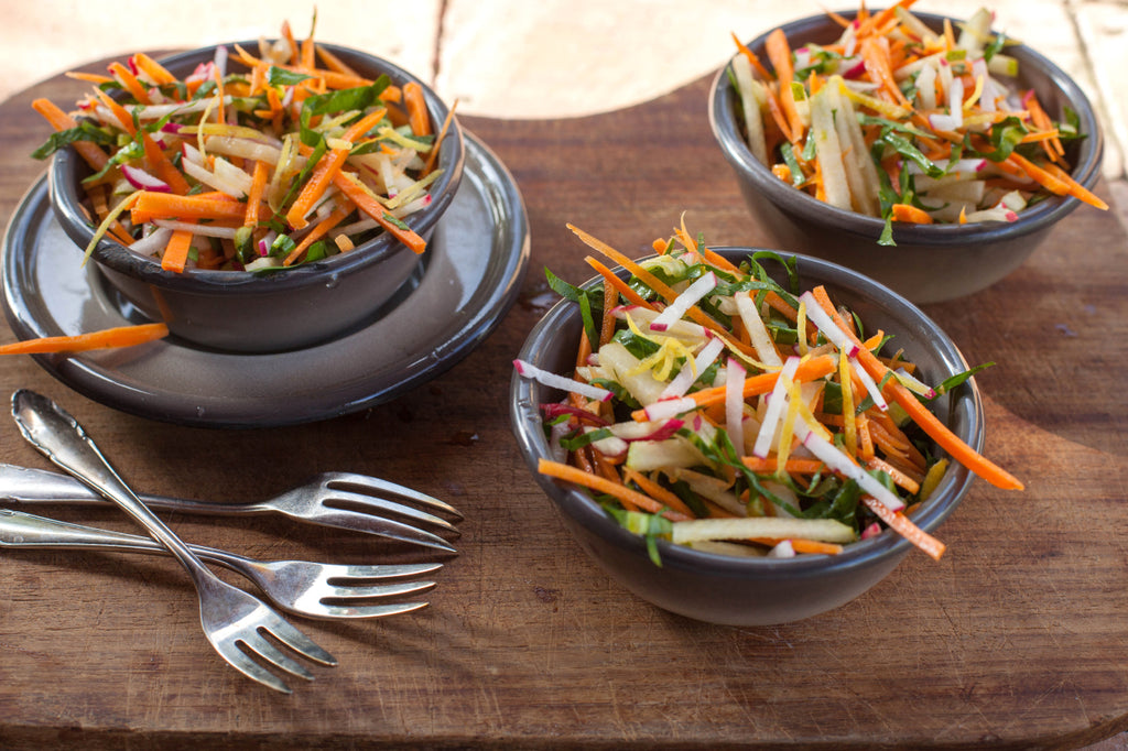 In a large bowl, toss the cabbage, carrots, radishes and sesame seeds with the dressing. Serve immediately if you like it very crunchy or let it sit covered in the refrigerator for up to a few hours if you prefer it more slaw-like.