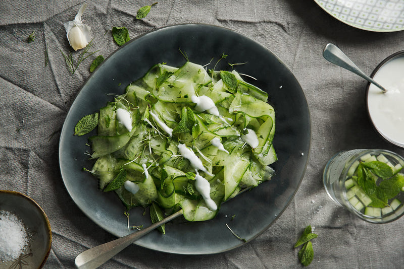 In small bowl, whisk together yogurt, olive oil, mint, lime juice, and lime zest. Season with sea salt and pepper. Sprinkle cucumber salad with microgreens, if using, and drizzle with yogurt sauce. Serve immediately.