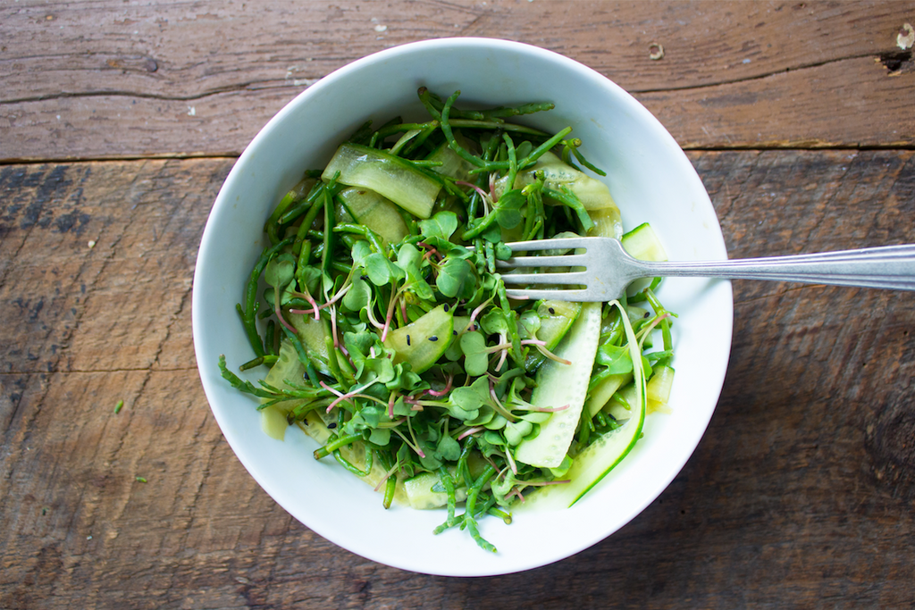 Using a mandoline or sharp chef’s knife, slice the cucumber thinly lengthwise. Combine the rice wine vinegar, toasted sesame oil, tamari, black and white sesame seeds and sugar in a medium bowl and whisk. Add the sea beans and cucumber. Place in the refrigerator to marinate for at least 30 minutes before serving.