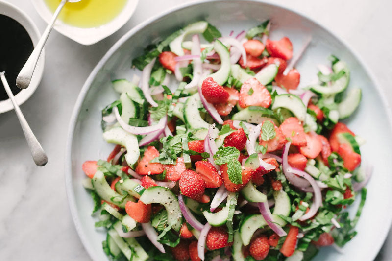 Hull strawberries and slice into thirds. Cut cucumber in half, lengthwise; then scoop out seeds and slice into ¼ -inch half moons. In a large bowl, combine strawberries, cucumbers, red onion and mint. Gently toss ingredients to combine