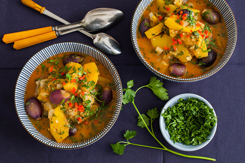 Preheat your oven to 400 degrees. First thing, get the squash in the oven. After cutting off the stem, cut squash in half from top to bottom. Scoop out the seeds. (We recommend roasting the whole squash, though you only need half of it. The other half will keep well in the fridge.) Place the squash cut side down on a cookie sheet and pop it into the oven. Toss the potatoes with two tablespoons of olive oil, salt and pepper. Spread in a single layer in a baking dish and put in the oven. The squash will take about 25-30 minutes and the potatoes a bit less. While they are roasting, begin the stew.