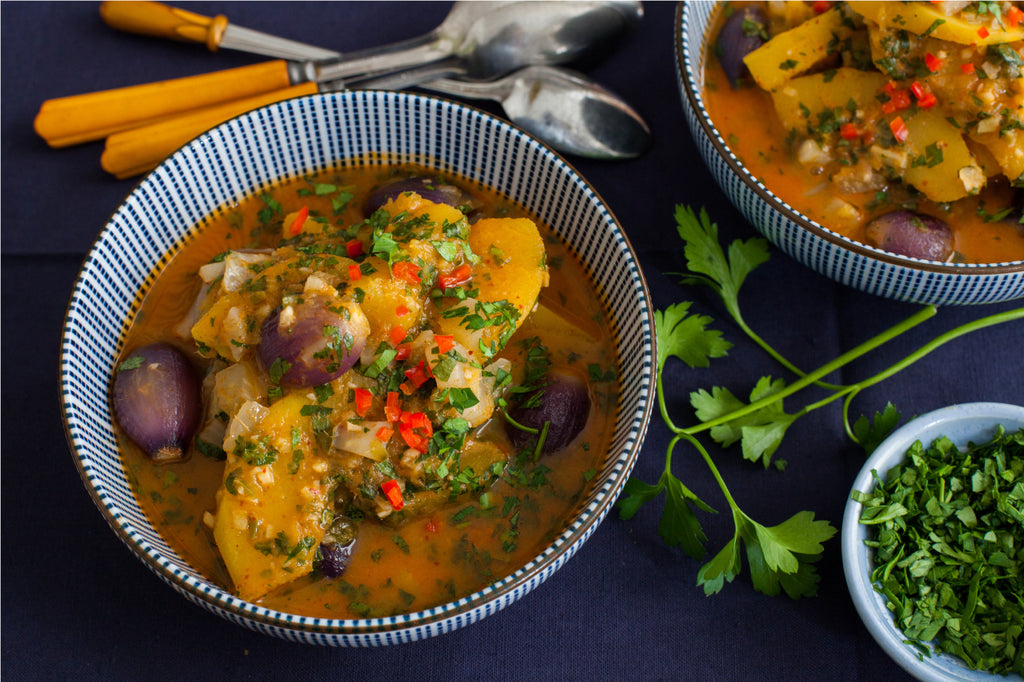 Preheat your oven to 400 degrees. First thing, get the squash in the oven. After cutting off the stem, cut squash in half from top to bottom. Scoop out the seeds. (We recommend roasting the whole squash, though you only need half of it. The other half will keep well in the fridge.) Place the squash cut side down on a cookie sheet and pop it into the oven. Toss the cauliflower with two Tbsp of olive oil, salt and pepper. Spread in a single layer in a baking dish and put in the oven. The squash will take about 25-30 minutes and the cauliflower a bit less. While they are roasting, begin the stew.